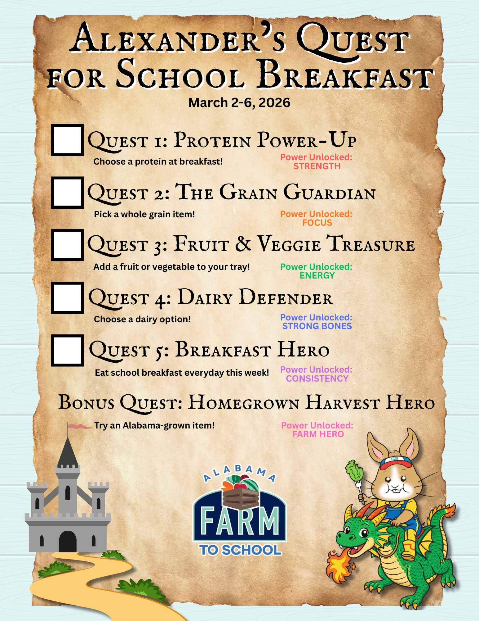 Farm to School Incentive Program Apple Crunch Day Procuring Alabama Fruits and Vegetables Handbook Farm to Summer Resources ALSDE Child Nutrition Programs Harvest of the Month Local Product Flyers Newsletter/Other Produce Safety Tips Tasting Scorecard Chef Jonathan’s Mixed Greens Soup Recipe Alexander’s Quest for School Breakfast